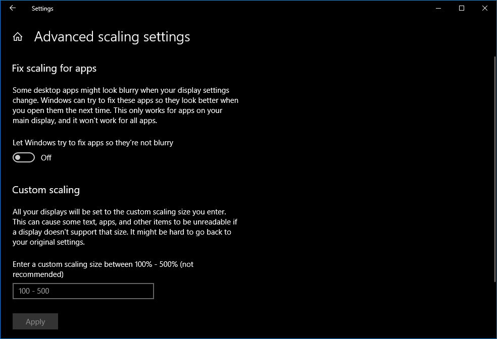 Visit Settings > Display > Advanced scaling options to enable the “Fix scaling for apps” feature. It allows Windows 10 to prevent older apps from looking blurry on high DPI displays.