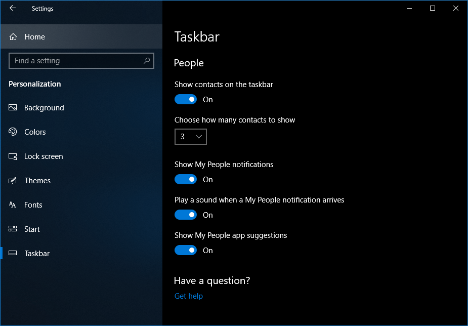 To turn off My People and manage other options, visit Settings > Personalization > Taskbar .
