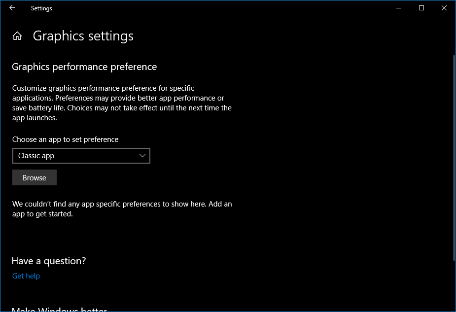 Now, the Settings app has a new page to manage graphics settings on Windows 10 PCs with multiple GPUs. You can access them in Settings > System > Display > Graphics Settings . Here you can assign Power Saving or High-Performance modes for both classic and Microsoft Store apps individually.