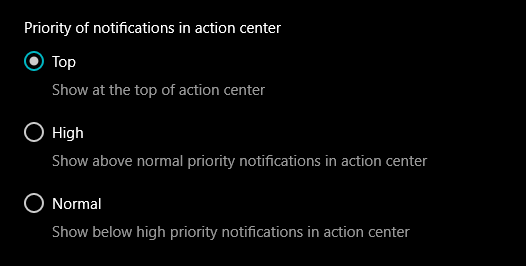 As the name suggests, choosing the Top option will always display notifications from that app above other in the Action Center.