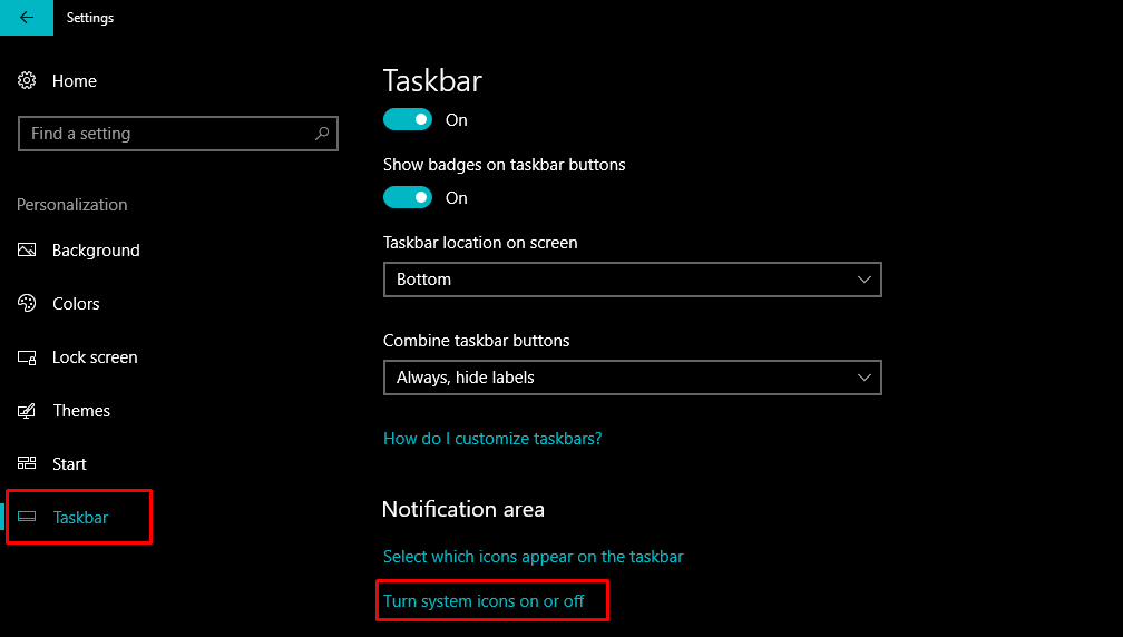 Now, click “Turn system icons on or off” option. On the next screen, turn off the toggle button for Action Center.