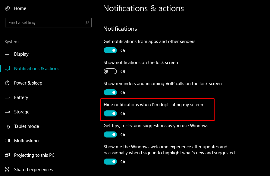 When connected to an external display, you can configure notifications to not put their leg in between. Turn on the toggle button that says Hide notifications when I’m duplicating my screen .