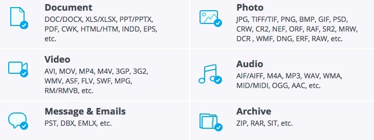 Wondershare Data Recovery software supports multiple types of files–document, images, video, audio, email, and archive. Here’s the complete list of supported file types: