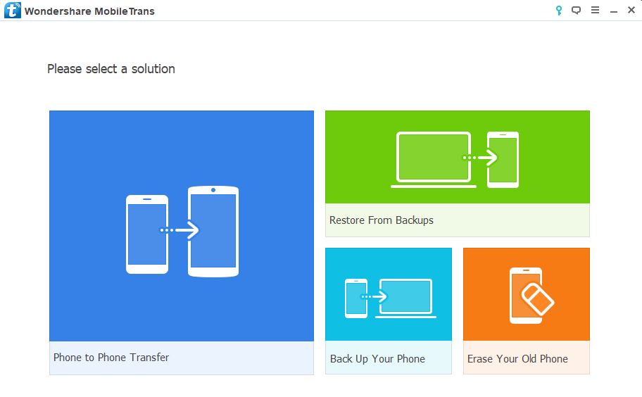 MobileTrans follows the design philosophy of other Wondershare software. It greeted me with a clean interface with four big buttons on the home screen. These buttons are different options for tasks that you can perform with the help of MobileTrans. Nothing is confusing here about the user interface. In the toolbar on the top, there are options for account information, online help, etc.