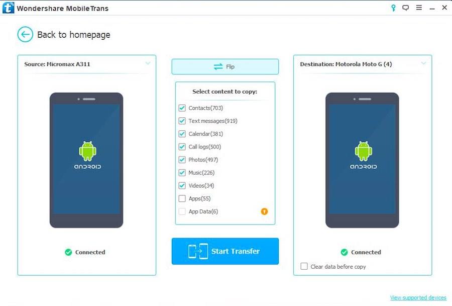 After the first phone, I connected the other device. The same MobileGoConnector app was also installed on Micromax A311. With a simple flip button in MobileTrans, you can swap the source and destination phones. This option can reverse the process, so make sure that your source phone and destination phone are at correct places. Till now, everything was smooth and described in a step-by-step manner.