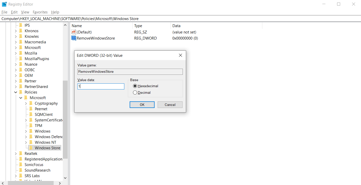 Create a new DWORD value within the Windows Store key and name it ‘RemoveWindowsStore’ and give it the value of ‘1’.