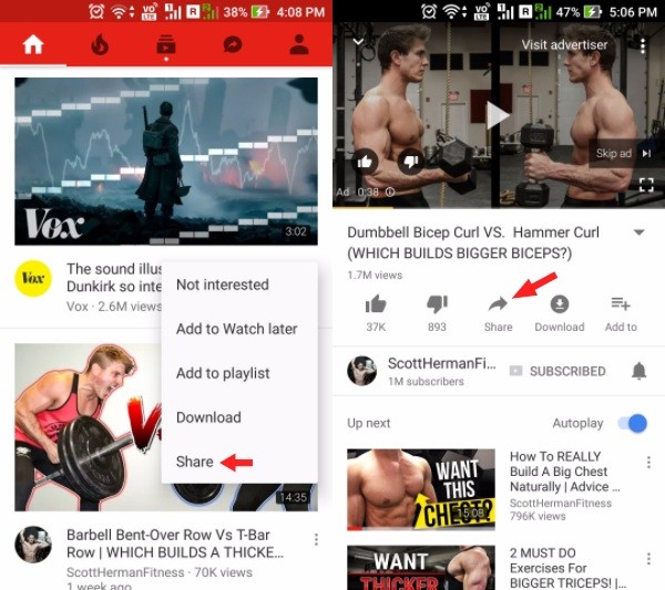 Second, for any YouTube video, you can tap the overflow menu button (three dots) and tap the Share option and then select the person. You also use the Share option while a video is playing.